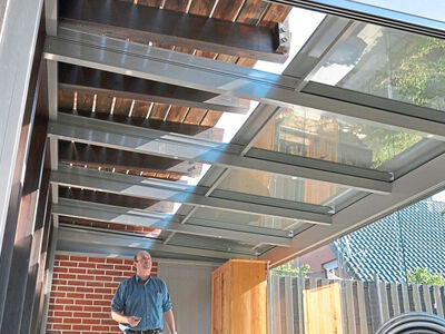 Ein halbes Jahr ging ins Land, bis Hubertus Haking die passende Antwort parat hatte und mittlerweile vor Ort auch realisiert hat. Er entwickelte einen passgenauen Wintergarten, der als Dachkonstruktion über eben jene Blechwanne verfügt, die unter dem Balkon Regenwasser und Schmutz auffängt, sowie eine Glasscheibe, die bei hoher Sonneneinstrahlung durch die verschiebbare Wanne beschattet wird und zugleich die vielen Vorteile bietet, die schon das patentierte Schiebe-Dachfenster für sich reklamiert.